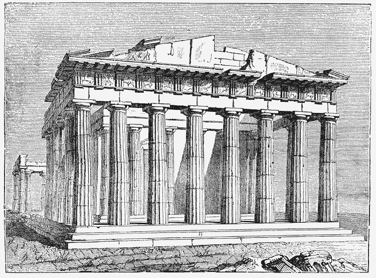 We shall proceed with our description of the Athenian antiquities in the British Museum, as soon as the collection is numbered according to its present arrangement. We understand from the Officers of the Institution that this essential assistance to the visitor will be immediately given; for the old order of the several pieces of sculpture being considerably altered, a reference to the former numbers only would prove embarrassing. In the mean time we give that view of the Parthenon, for which the representation of the temple of Apollo Epicurius, near Phigalia, was substituted by mistake.