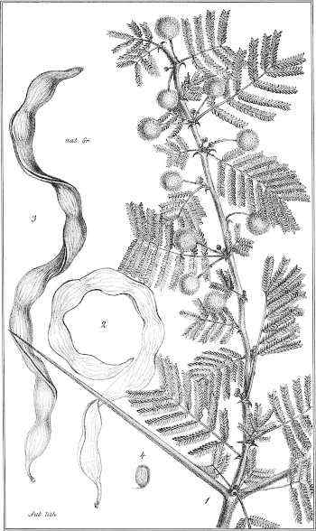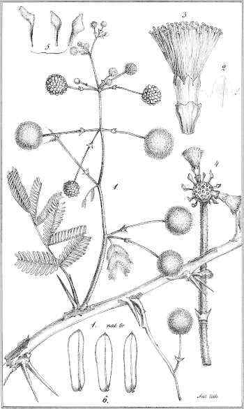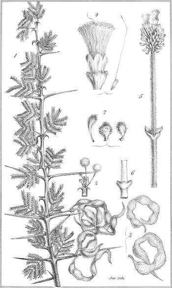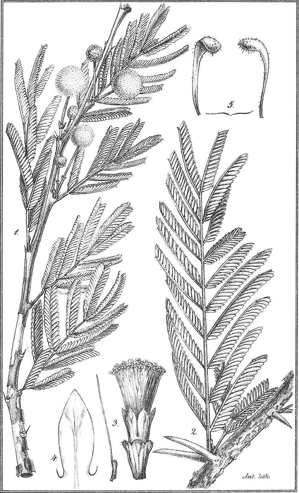 Taf. XV. 1. Ein blühender Zweig mit zwei einjochigen Blättern. 2. Desgl. mit 2-jochigen Blättern. (nat. Gr.) 3. Blüthe und Fruchtknoten. 4. Staubgefäss. 5. Blüthenköpfchen nebst Stiel.