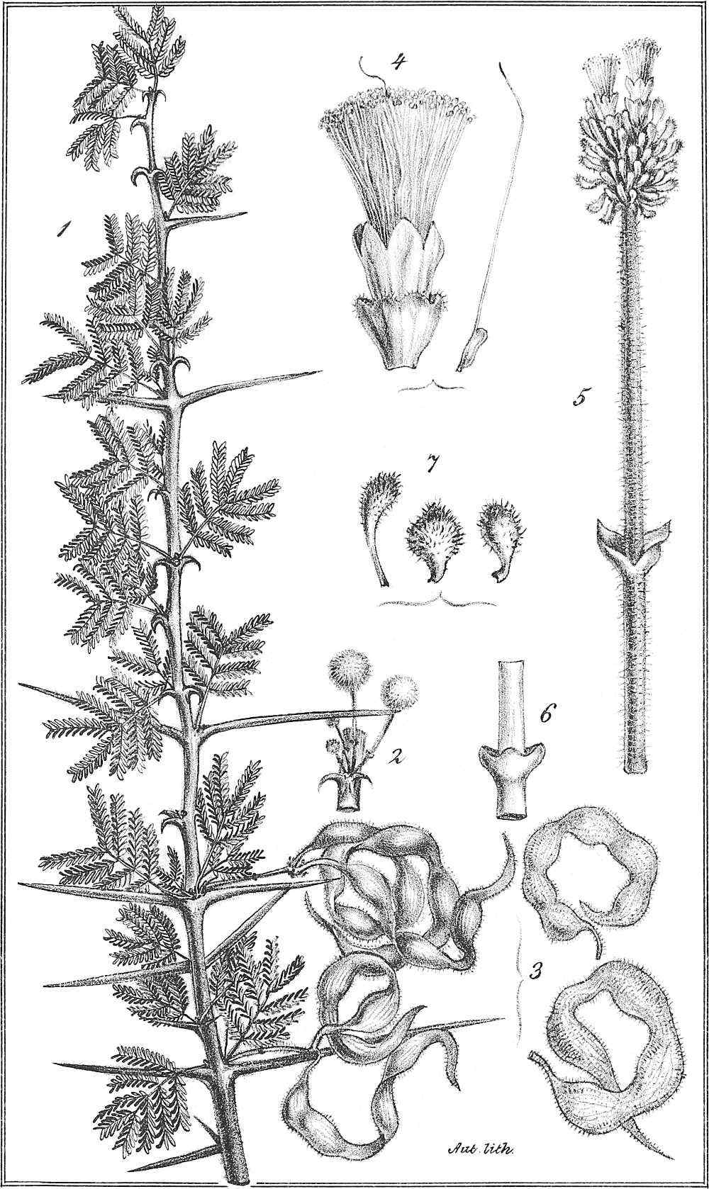 Arbor media trunco erecto cortice griseo-rimoso in ramis pallidiore in novellis albido striato tomentoso; aculeis ternatis, infrastipularibus atris nitidis ad apicem ramorum lucidis plus minus nunc deorsum nunc sursum curvatis, infrafoliaceo aequali recurvo; foliis cinereo-viridibus uncialibus junioribus tomentoso-villosiusculis 3-5-jugis, foliolis 10-15-jugis parvulis linearibus longitudine latitudinem 4-5-superantibus acutiusculis, petiolo communi basi apiceque glandula parva ornato; inflorescentia coaetanea folia paullo antecedente spicis 3-pollicaribus folia multo superantibus albidis in axillis singulis interdum 3-aggregatis; leguminibus 3-4-pollicaribus linearibus membranaceo-coriaceis pallidis[375] basi attenuatis apice acutiusculis planis tenuissimis transverse venosis marginibus parallelis vel saepius undulatis interdum valde constrictis 5-6-spermis; seminibus subrotundis valde compressis aeque longis ac latis interdum latioribus quam longis linea arcuata concava medio notatis.