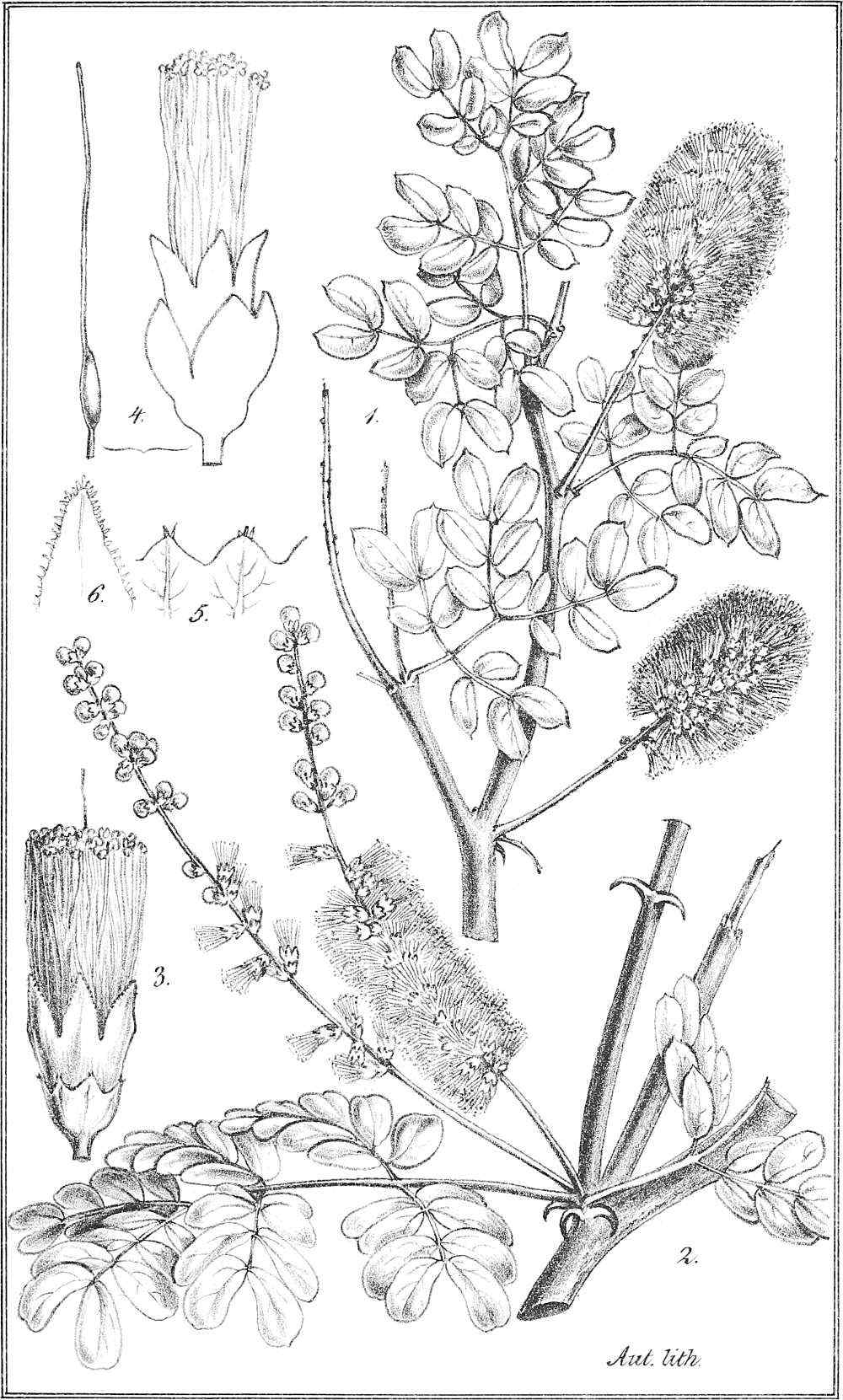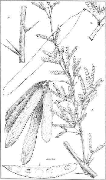 Arbor erecta ramis cortice fusco-glabro, in junioribus anguloso-striato pallidiore; spinis validis interdum abortivis ½-2-pollicaribus rectissimis horizontaliter patentibus sensim attenuatis supra planis latere 2-angularibus pallidis rarius fuscescentibus; foliis puberulis saturate viridibus bipollicaribus, pinnis 6-13-jugis, foliolis 12-20-jugis parvulis acutiusculis apice paullo latioribus longitudine latitudinem 5-superantibus, petiolo communi basi 1-glanduloso; inflorescentia coaetanea, spicis in axillis 2-3-aggregatis vel solitariis, latis, 1-4-pollicaribus, flavis folium subaequantibus vel duplo superantibus, floribus subremotis, albidis (?), leguminibus longiuscule pedicellatis late-oblongis 2-pollicaribus obtusis[360] mucronulatisve marginibus parallelis subcoriaceis planis fuscis nitidis irregulariter venosis paullo pulposis 6-12-spermis, seminibus olivaceis oblongis.