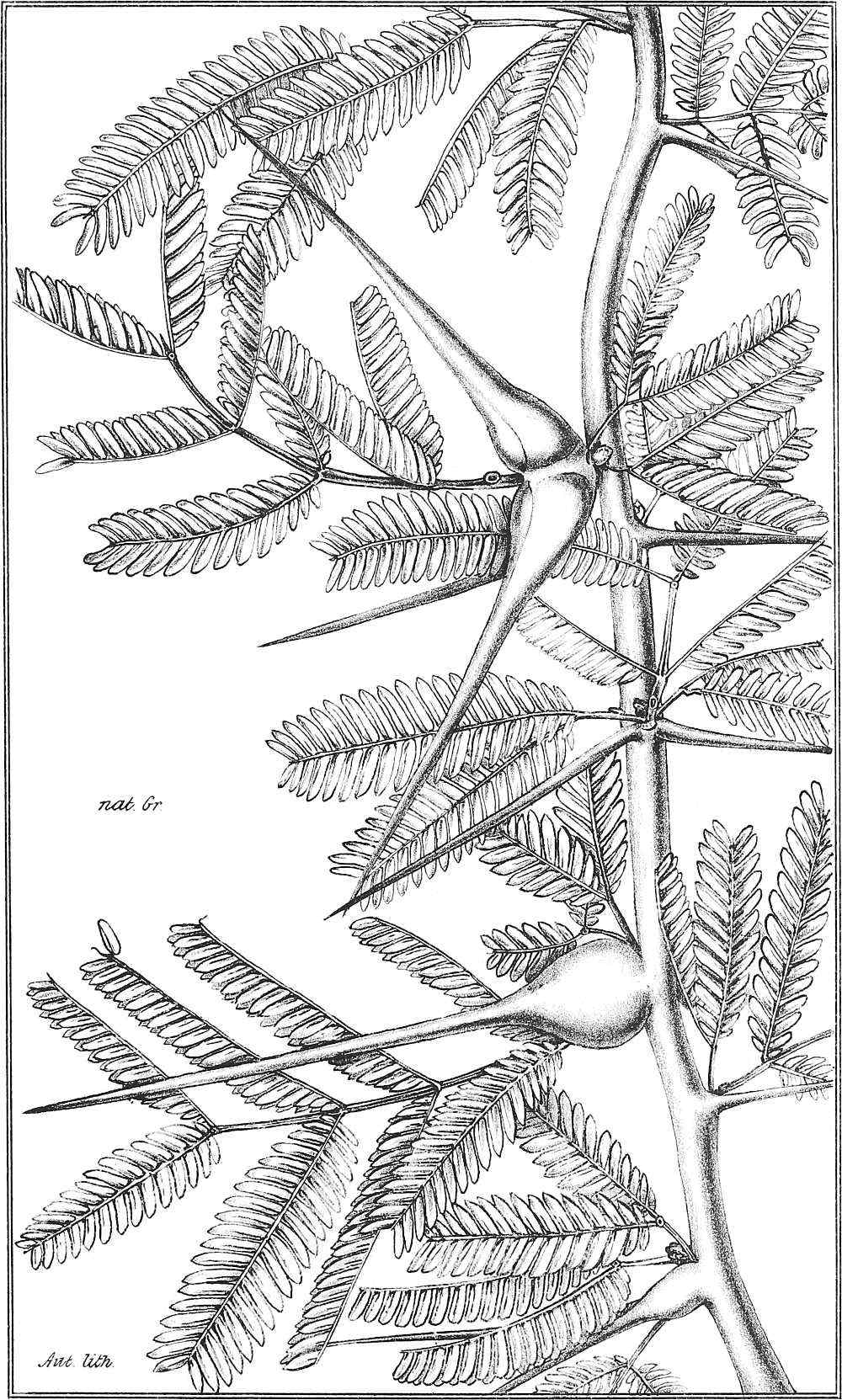 Ohne auf den Conflict näher eingehen zu wollen, in welcher die grösste Gleichheit einerseits der verschiedenen Dornen und Stachelgebilde bei den Acacien in functioneller Beziehung mit ihrer morphologischen Bedeutung gerathen[2],[315] soll hier nur im Allgemeinen auf die grossen, bei den betreffenden Beschreibungen näher auseinandergesetzten Veränderlichkeiten dieser Gebilde hingewiesen werden.