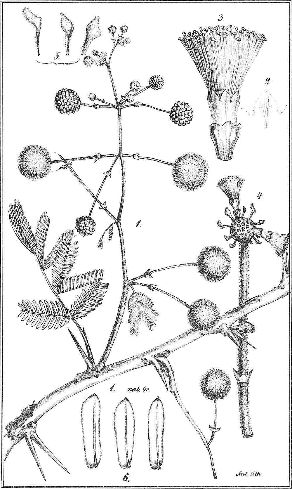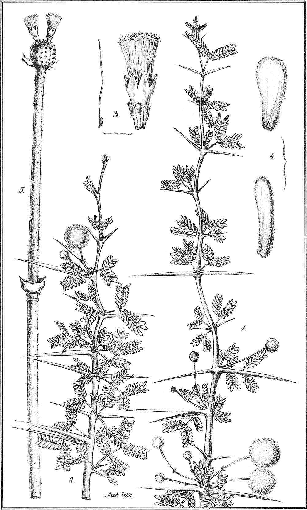 Obgleich ich nicht der von den Autoren der Flora des Senegals vertretenen Ansicht, als sei A. Senegal W. ein Synonym der A. albida D., beipflichten kann (da die Willdenow’sche Diagnose ausdrücklich von 3 Stacheln spricht, „spinis ternis intermedio reflexo“), so will ich dennoch, um Irrungen zu vermeiden und da sich hierüber keine Gewissheit erlangen lässt, den von den Negern am Senegal gebrauchten Namen Verek für diese Art aufrecht erhalten.