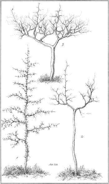 Der Kittr bildet vielverzweigte, dichte Bosquets, welche meist in halbkugeliger Gestalt auftreten. Jeder Reisende in jenen Ländern weiss genug von seinen hakigen Doppelstacheln zu erzählen, welche, in Form eines Halbkreises gekrümmt, sehr feine Spitzen haben und sich daher leicht in den Kleidern,[367] ja selbst in der Haut des Vorübergehenden verfangen und nur mit grosser Mühe auszuhaken sind, während sie so fest an den Zweigen haften, dass man sich mit Gewalt von ihnen kaum befreien kann.