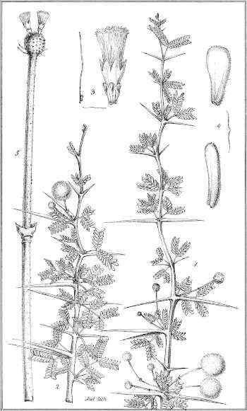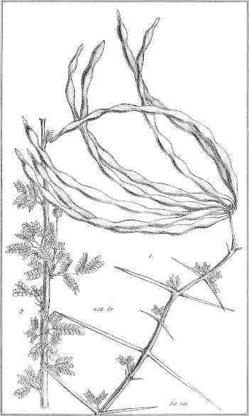 Bis zu welchem Grade die wesentlichsten Merkmale der Exemplare je nach der Region des Astes, welchem sie entnommen wurden, abgeändert werden können, das zeigt uns[314] beispielsweise das Auftreten zahlreicher Stacheln am Mittelnervstiel[1] der Blätter des Stockausschlages von A. Catechu, ein Fall, welcher sich an üppig entwickeltem Laube der A. mellifera wiederholt. Ein ähnliches Beispiel liefern die oft fast nur mit gekrümmten, verkümmerten Dornen bedeckten blühenden Zweige der A. tortilis oder spirocarpa, auch diejenigen der A. glaucophylla und anderer, welche an solchen Zweigen oft alle Stacheln verlieren. Der unter dem Blattstiel sitzende dritte Stachel der Diacanthae fehlt oder erscheint, je nach der Art der Zweige, welche vorliegen, u.s.f.