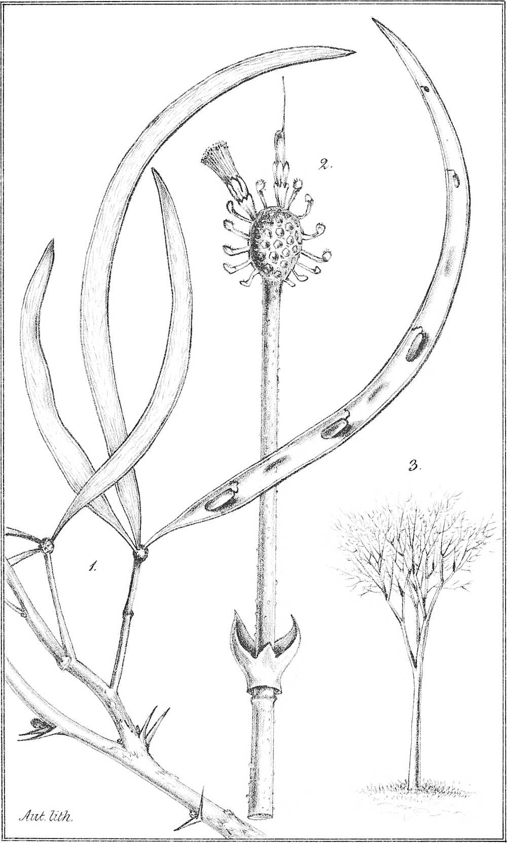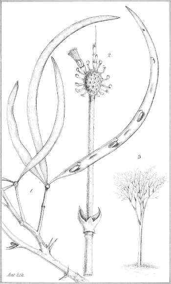 Taf. XVIII. 1. Ein fruchttragender Zweig. 2. Ein Blüthenköpfchen mit Stiel und Bracteenkragen. 3. Baumschema.