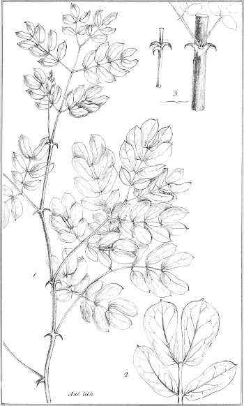 Taf. XX. 1. Blattzweig. (Nat. Gr.) 2. Blättchen (vergr.). 3. Zweigtheile mit gedreiten Stacheln. (Nat. Gr.)