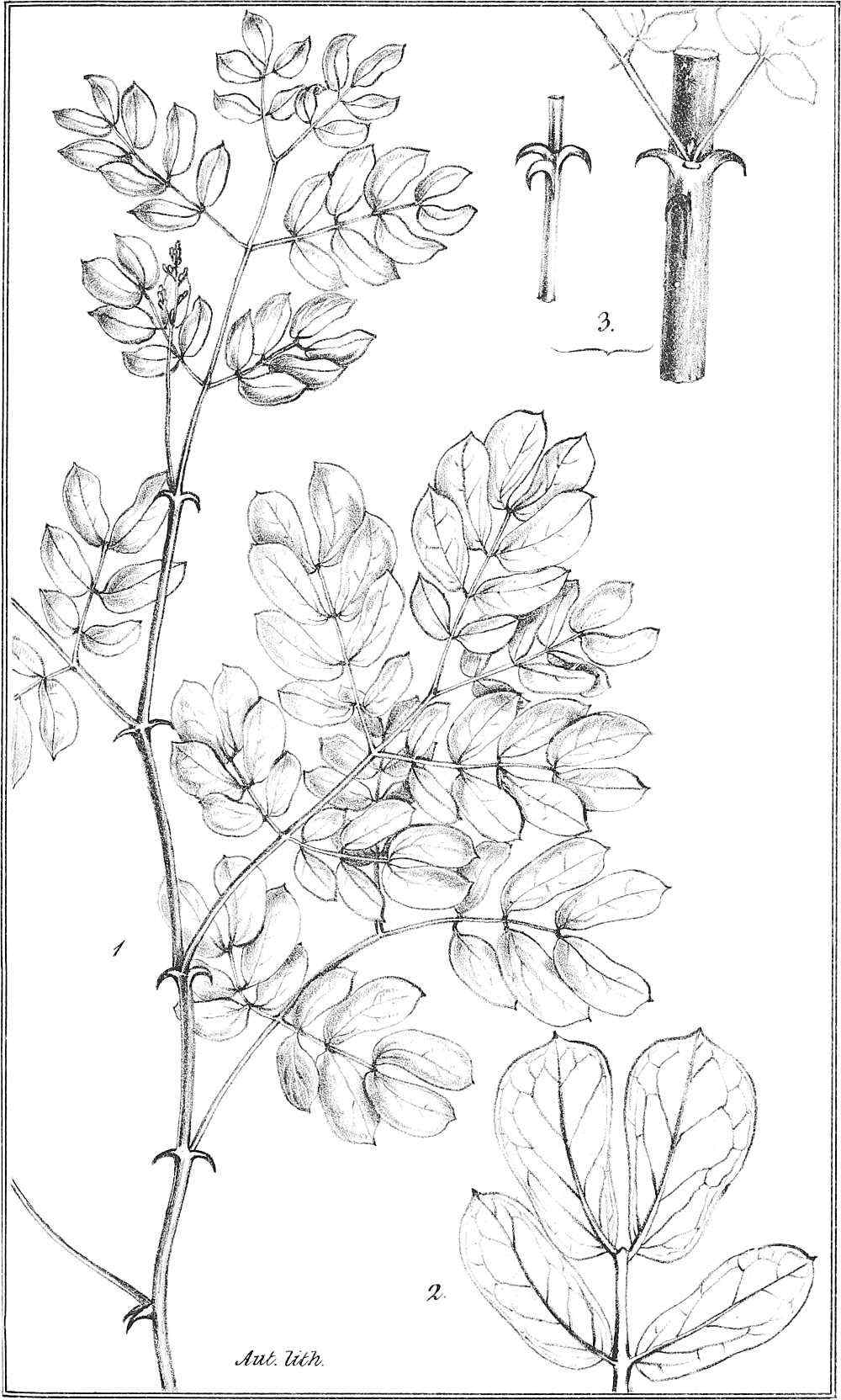 Arbor media, interdum frutex, trunco erecto cortice nigro in ramis atro-griseo, rarius griseo-fusco vel rubente; aculeis ternis aterrimis in ramulis interdum lucidis saepe nullis, infrastipularibus patentibus rectis vel paullo recurvis teretibus in ramulis basi latis latere compressis, infrafoliaceo aequali vel deorsum magis recurvo; foliis glauco-viridibus 3-6-pollicaribus glaberrimis pinnis 3-6-jugis, foliolis 12-20-jugis laxiuscule insertis majusculis oblongo-linearibus apice obtusis vel acutiusculis subtus pallidioribus rarius puberulis, petiolo communi basi glandula parva albida notato saepe purpurascente; inflorescentia coaetanea spicis in axillis 1-5-aggregatis[373] laxis folium aequantibus vel eo brevioribus 3-5-pollicaribus floribus albidis, saepe monstrosis coriaceo-inflatis; leguminibus 3-4-pollicaribus, ad 10-fasciculatis linearibus vel anguste linearibus rectis marginibus parallelis vel paullo undulatis rarius inter semina constrictis, membranaceo-coriaceis pallide fuscis vel purpurascentibus, supra semina parum inflatis tenuiter transverse venosis basi apiceque attenuatis vel acuminatis 5-7-spermis, seminibus fuscis nitidis ovalibus longioribus quam latis compressis medio linea arcuata concava notatis.