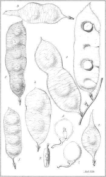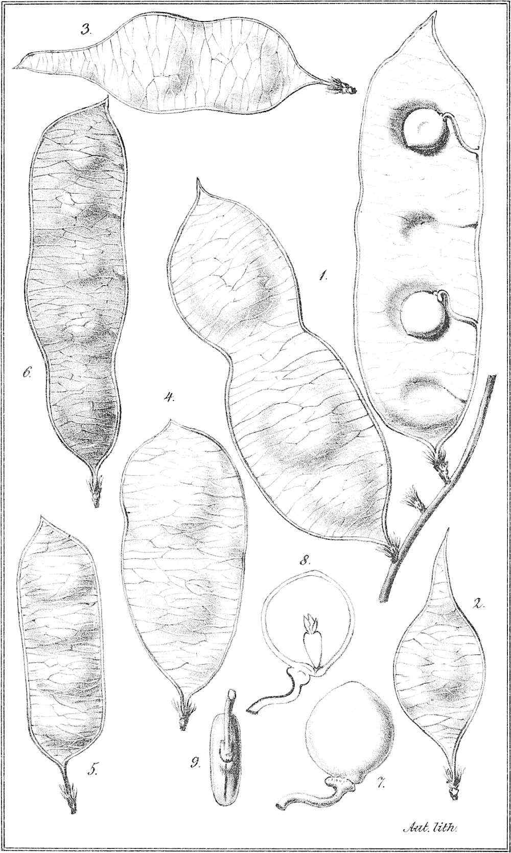 Taf. XXI. 1. Zwei Hülsen mit 3 und mit 4 Samen. 2. Hülse mit 1 Samen. 3. Dito mit 2 Samen und langer Spitze. 4. Dito mit 2 Samen und stumpfem Ende. 5. Dito mit 4 Samen, von geringerer Grösse und ohne Einschnürungen. 6. Dito mit 5 Samen, von ausnahmsweise länglicher Gestalt. (Alle nat. Gr.) 7. Same. 8. Längsdurchschnitt durch einen Samen. 9. Same von der Rückenseite gesehen.